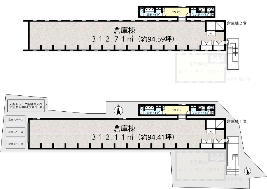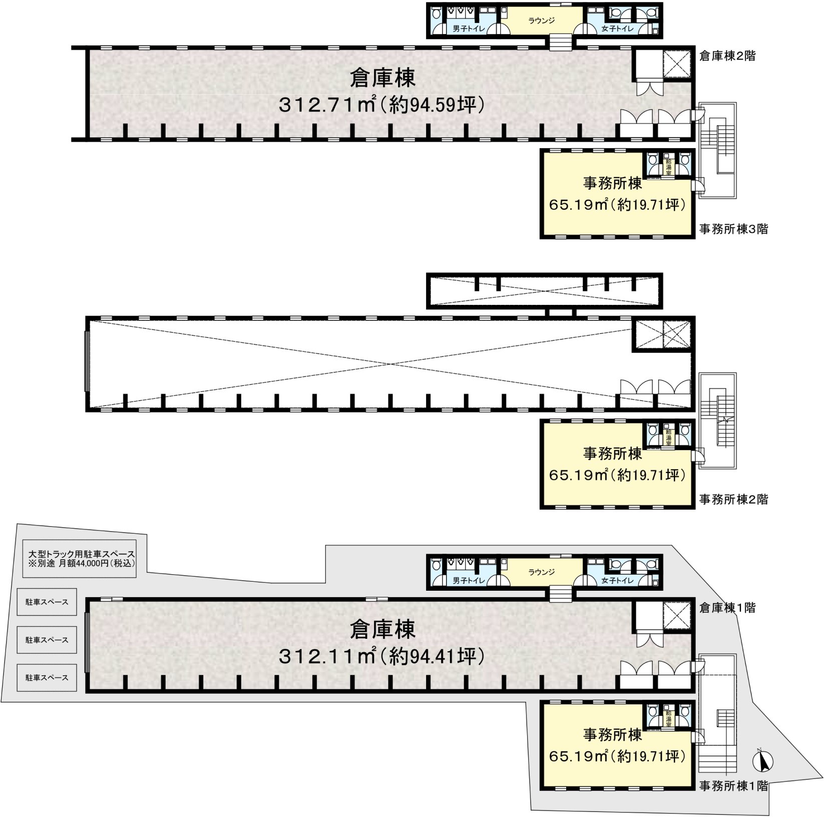 倉庫棟天高1階約4.3m、2階約3.1mと高めな設計のため、高さがあるものにも対応。1階にはシャッターがございます。また、倉庫棟各階に男女別トイレとラウンジもあります。事務所棟の各階に給湯室とトイレも2ヶ所あるため事務所利用として申し分なしの物件です。